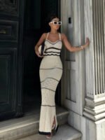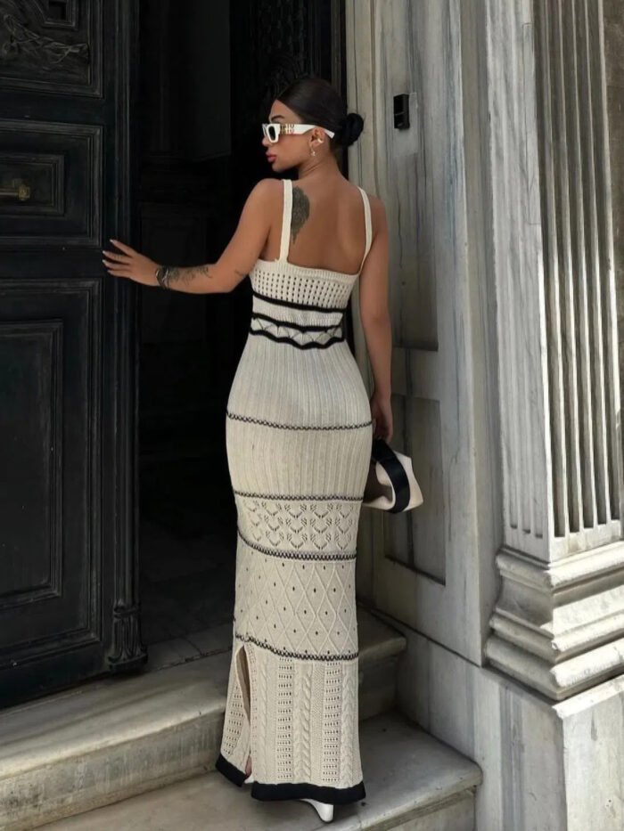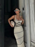 This chic maxi dress combines modern style with a touch of playful elegance. Featuring a trendy sweetheart neckline and thin, non-adjustable straps, it offers a delicate, feminine look while providing just the right amount of support. The intricate crochet design adds texture and visual interest, making it a standout piece for any occasion. Made from 100% cotton, this unlined dress ensures breathability and comfort, perfect for warm-weather outings.